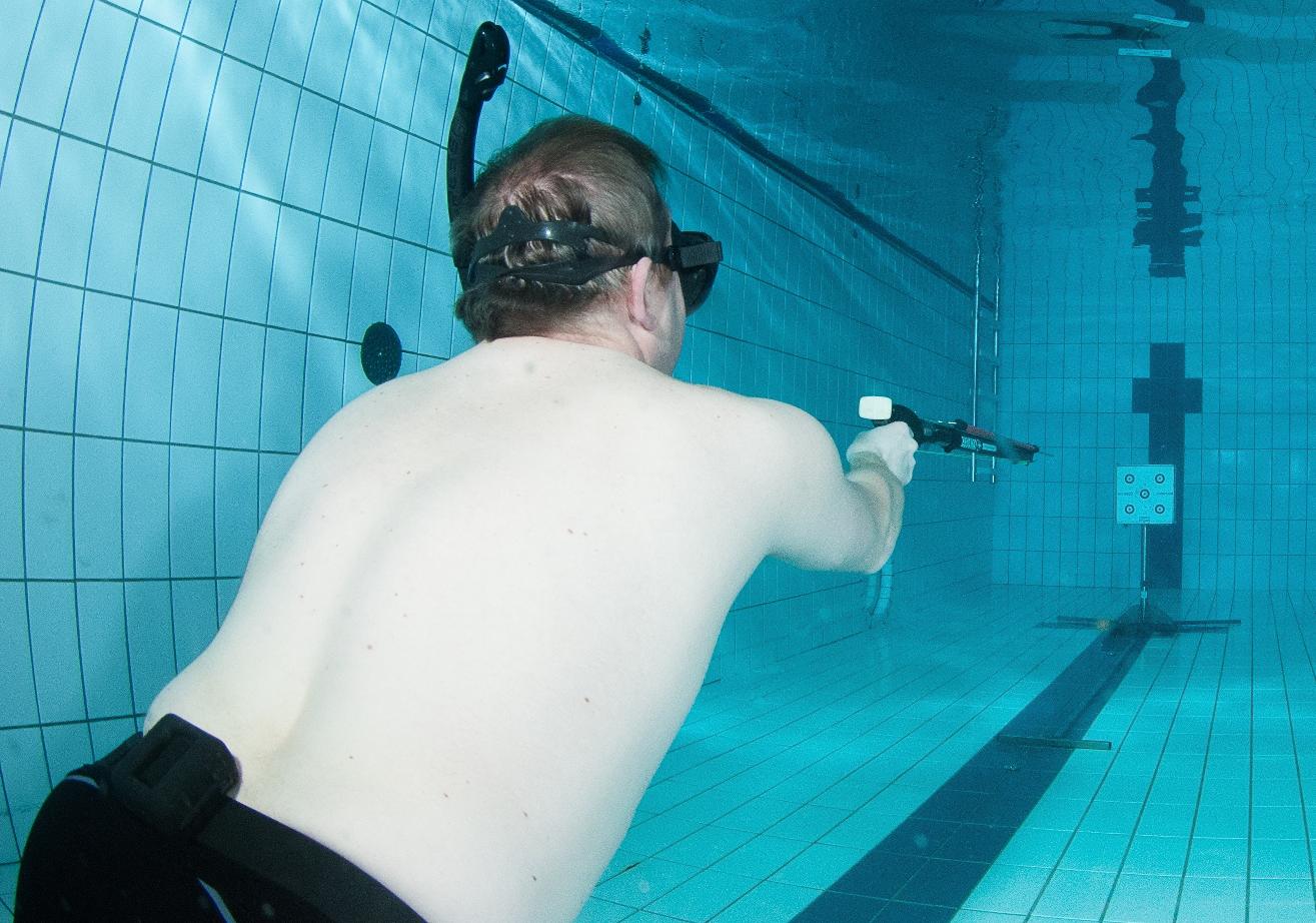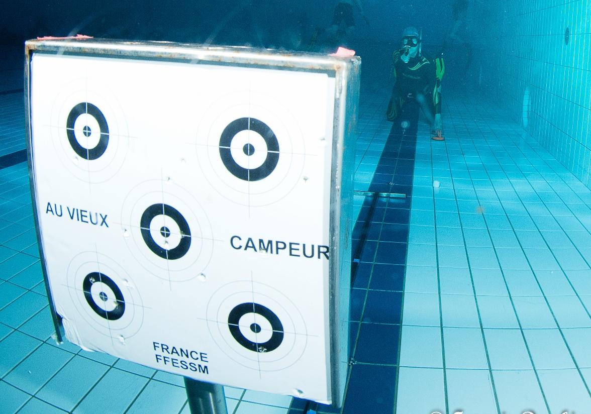 Cette discipline inspirée par les chasseurs sous-marins est devenue une discipline à part entière avec l’organisation de compétitions et de championnats. Le tireur est équipé d’un masque, d’un tuba et de palmes. Il dispose d’une arbalète armée d’une flèche. La cible est posée dans le fond de la piscine. Une distance réglementaire de 4 mètres entre la pointe de la flèche et la cible doit être respectée. Le tir sur cible permet de développer de nombreuses capacités physiques et mentales puisqu’il allie l’activité physique de l’apnée et la précision du tir. L’apnéiste est concentré sur sa visée en réduisant son attention spécifique liée à l’apnée. La répétition des tirs lors des entraînements permet d’en augmenter la précision. Cette activité est proposée en même temps que les séances de plongée en apnée.